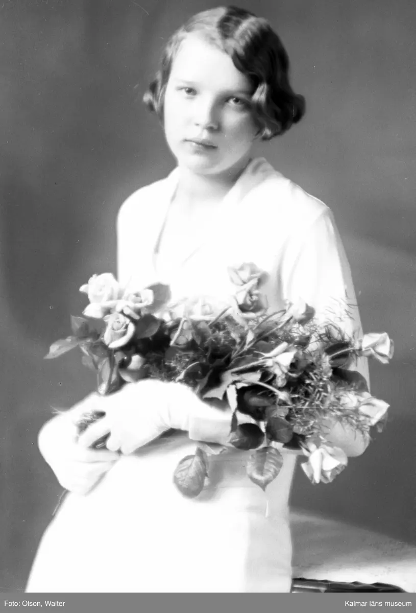 Ateljébild på en kvinna med en blombukett. Enligt Walter Olsons journal är bilden beställd av Anna-Lisa Bäckström.