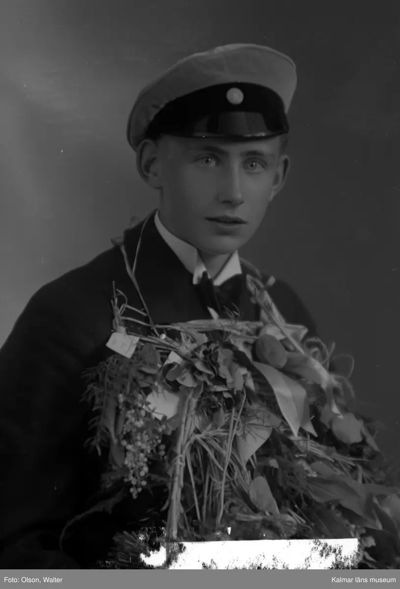 Ateljébild på en man som har tagit realexamen. Han har en blombukett och mössa. Enligt Walter Olsons journal är bilden beställd av Nils Johnsson.