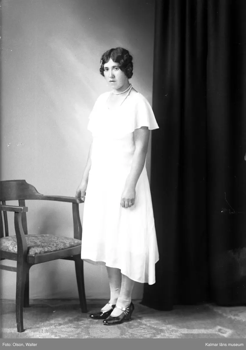 Ateljébild på en kvinna i klänning och halsband. Beställare till bilden: Gunhild Jonsson ifrån Nedra Ålebäck i Gårdby.