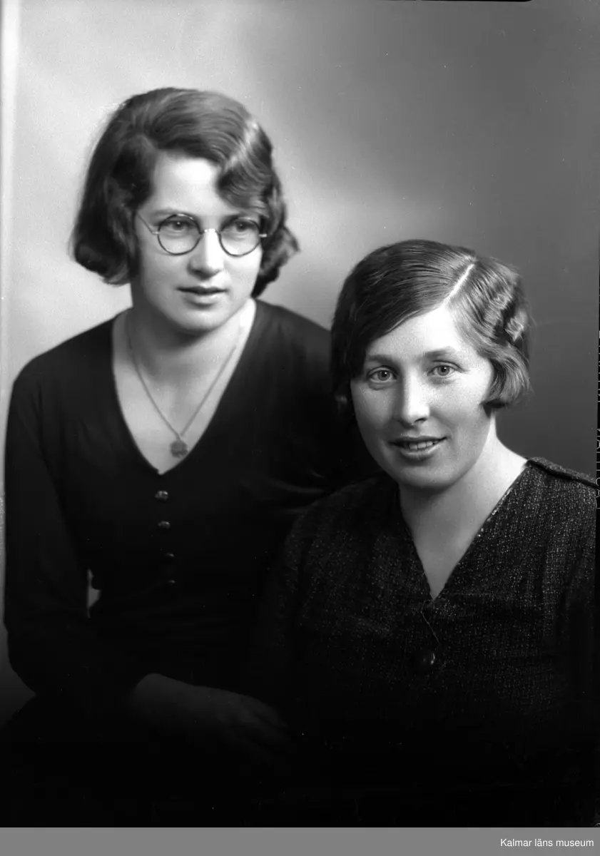 Ateljébild på två kvinnor, varav den ena har glasögon och halsband. Enligt Walter Olsons journal är bilden beställd av Anna-Stina Petterson.