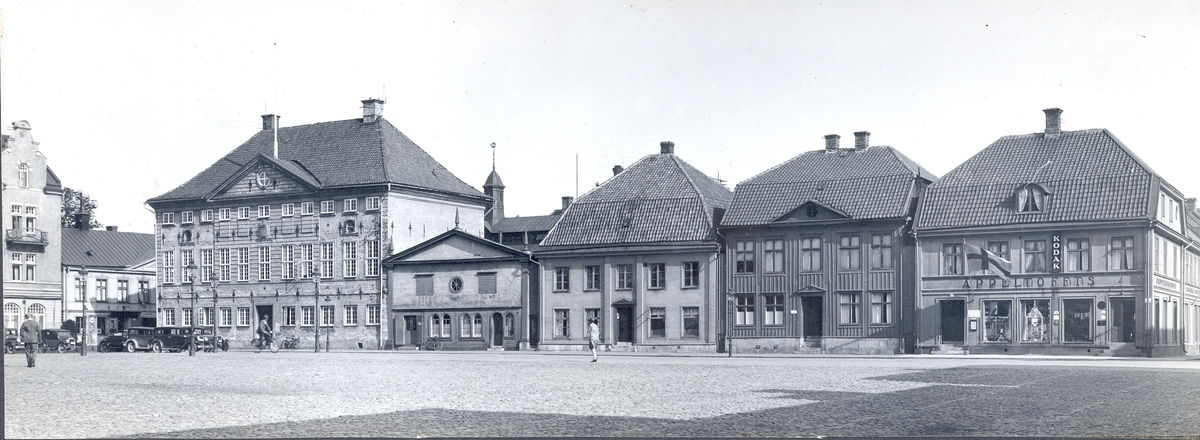 Byggnaderna längs Stortorgets södra sida med rådhuset till vänster. Undantagandes skyltfönster ser husraden ännu ut på detta vis och det gjorde den även på 1700-talet.