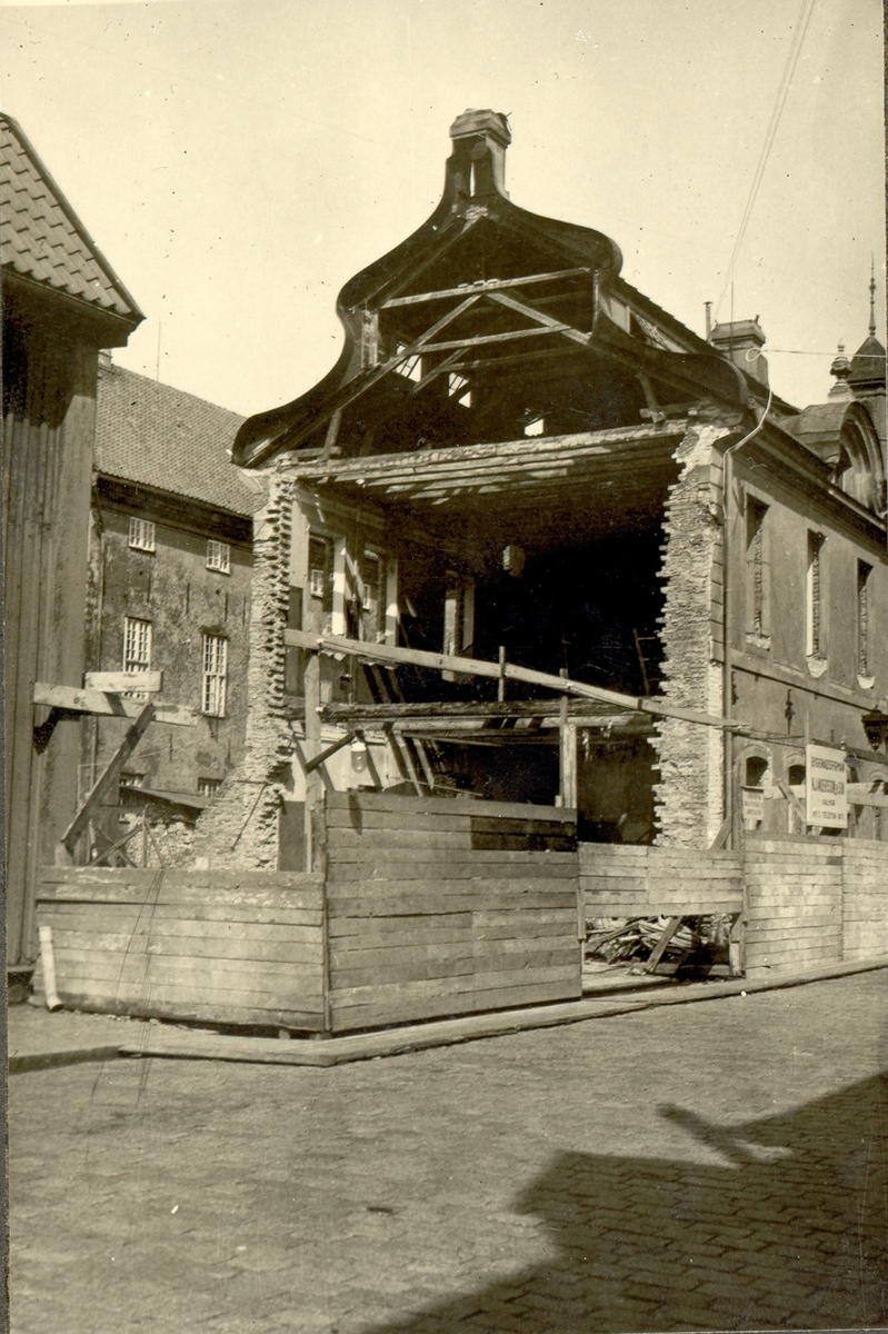 Rivning av en byggnad med säteritak och putsad fasad.