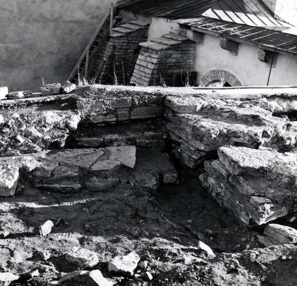 Utgrävning på Kalmar slott. Den äldre muren norr om södra muren sedd mot öster Rapporten: Krutkammaren, vallgraven, västra vallen och brunnar.