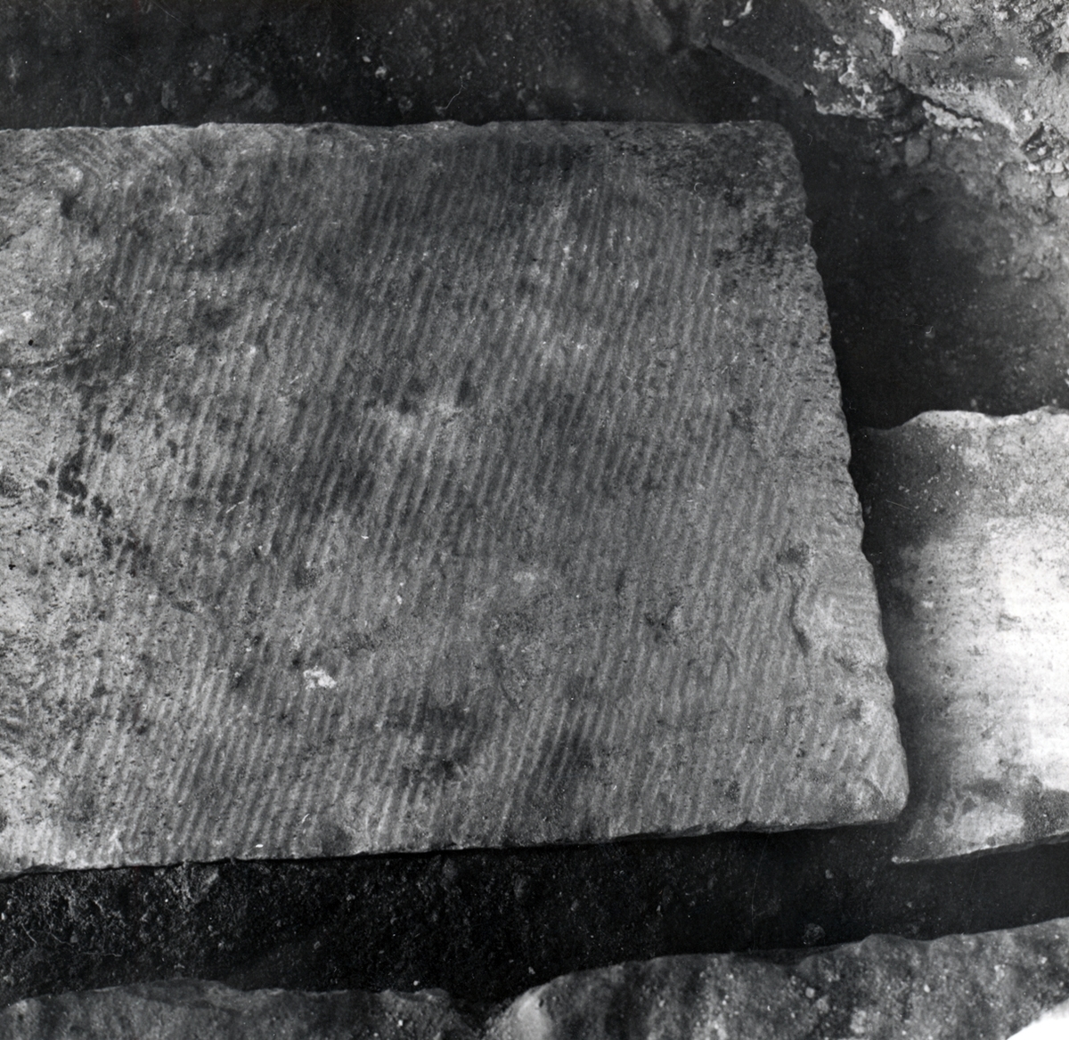 Utgrävning på Kalmar slott. Detalj av kalkstensplattorna. Rapporten: Krutkammaren, vallgraven, västra vallen och brunnar.