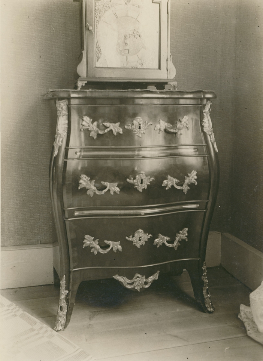 Liten byrå i rokoko. Inläggningar i enkla rutmönster. Skiva av trä. Beslag och lister förgylld brons. (Salen)