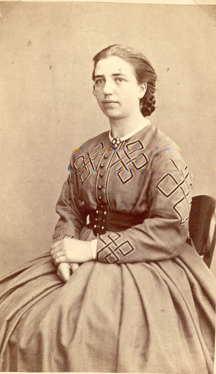 Ateljébild på en kvinna i brosch, klänning och skärpspänne.