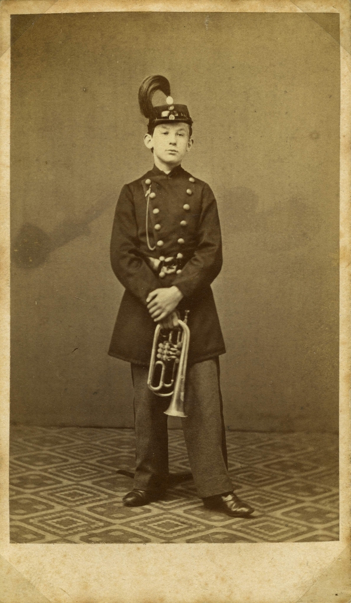 Axel Johansson i en militäruniform med plym. Pojken är en trumpetare.