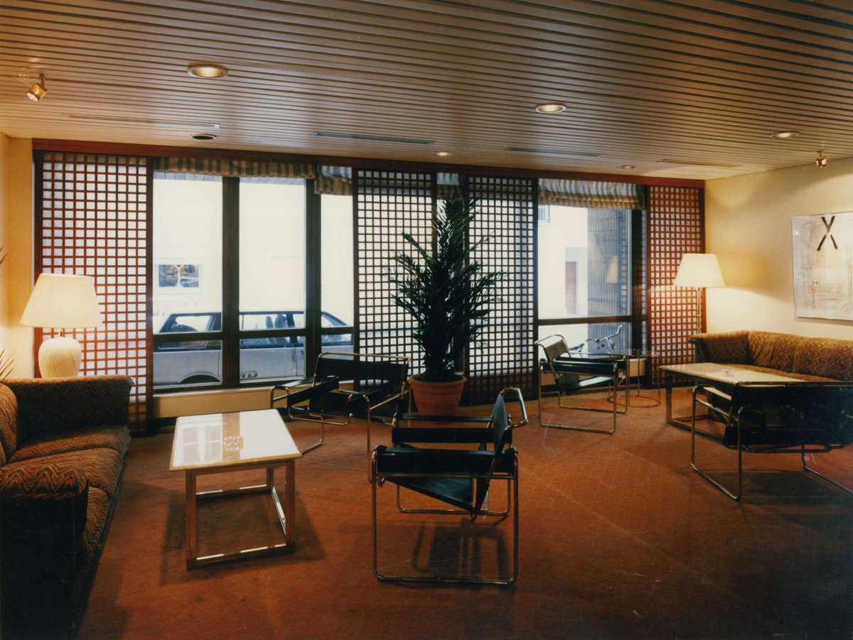 Lobbyn till höger om ingången, mellan receptionen och värdshuset på Hotell Witt.