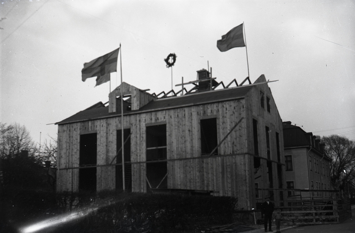 En nybyggnad av ett bostadshus där en taklagsfest har ägt rum.