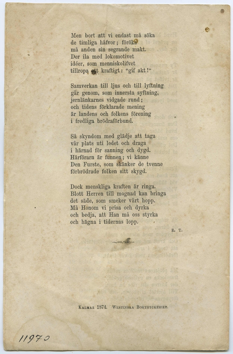 Vid Kalmar Jernvägs invigning den 8 augusti 1874. Kalmar 1874 Westrinska boktryckeriet.
