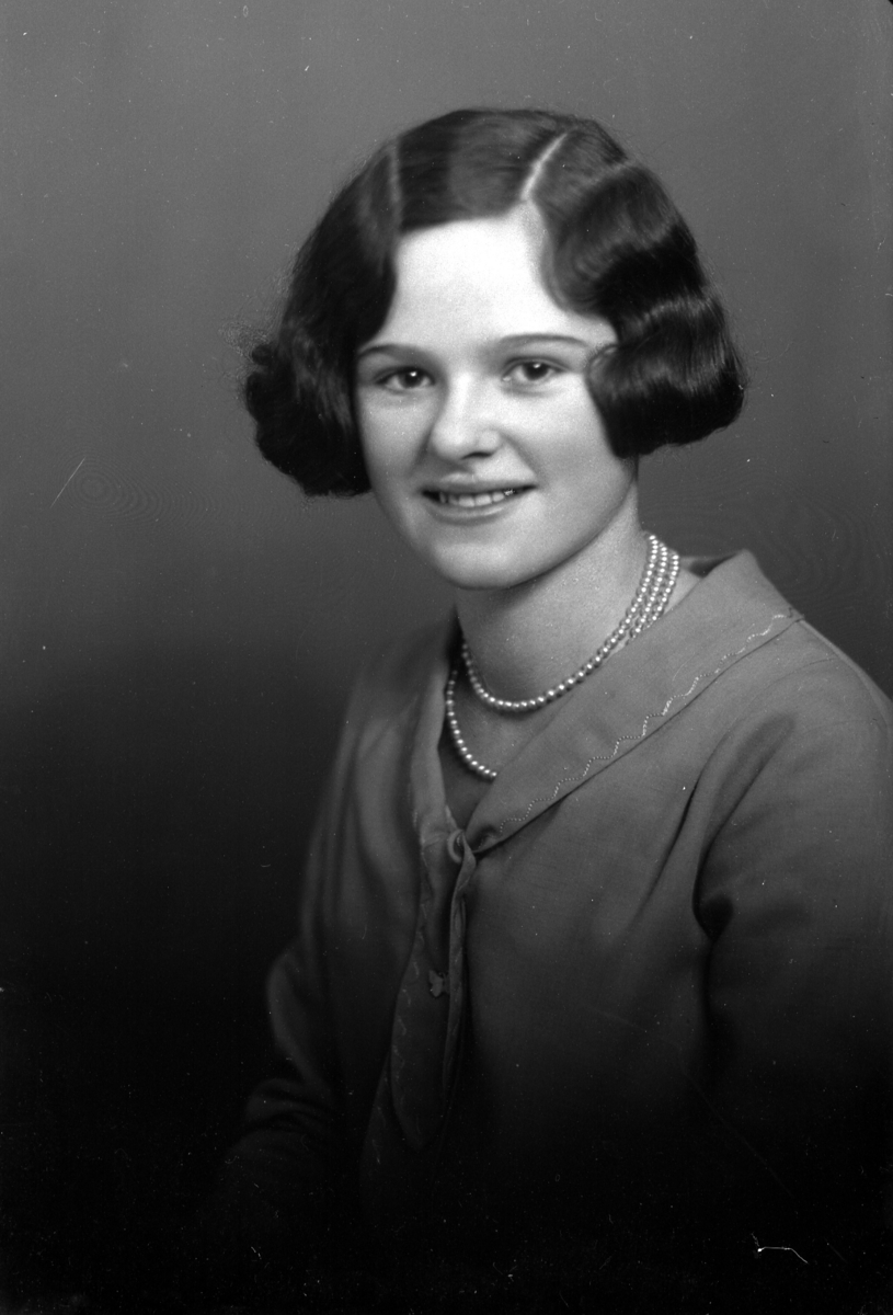 Ateljébild på en kvinna i blus och pärlhalsband. Enligt Walter Olsons journal är bilden beställd av Elisabet Andersson ifrån Kalmar.