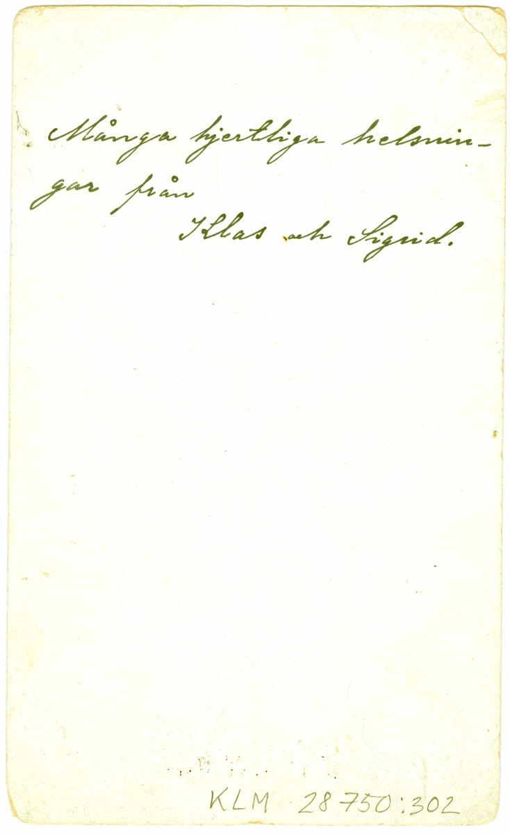 Baksida på julkort med texten. "Många hjertliga hälsningar från Klas och Sigrid".