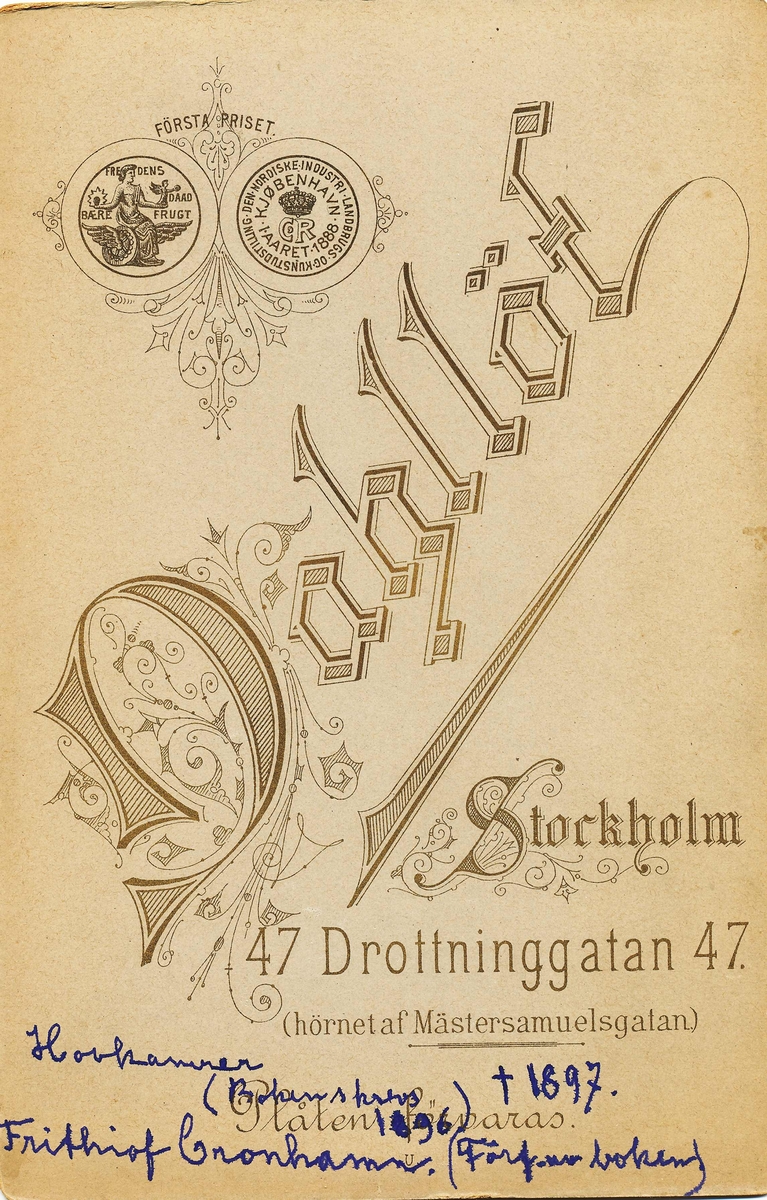 Tryckt text på fotots baksida: "Dahllöf, 47 Drottninggatan 47, (Hörnet af Mästersamuelsgatan), Stockholm.