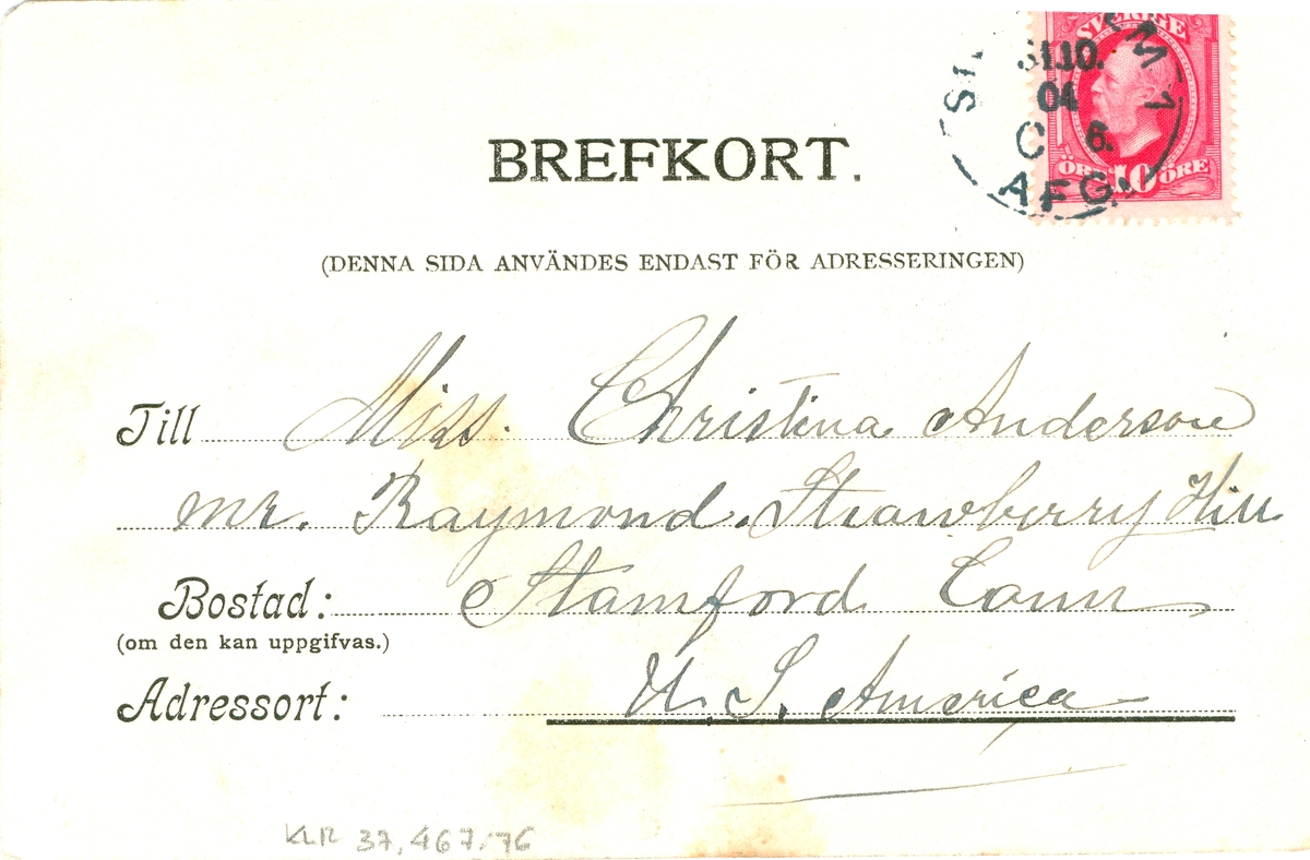 Ett vykort till Christina Anderson, Stamford, Connecticut, USA från Edvard Nilsson i Böda.