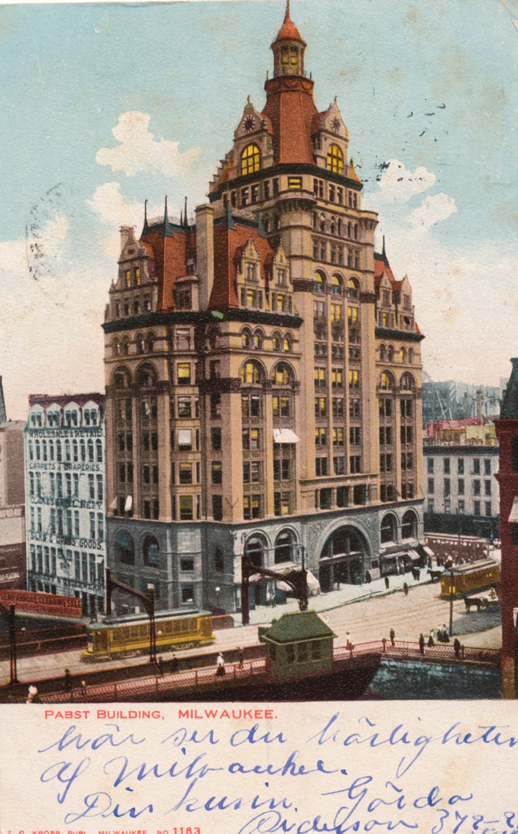 Vykort till Kristina Andersson, född 1865 i Böda, syster till N J Andersson, när hon bodde i USA från vänner i USA. Under motivet står det skrivet: "Här ser du härligheter af Milwaukee. Din kusin Gärda?