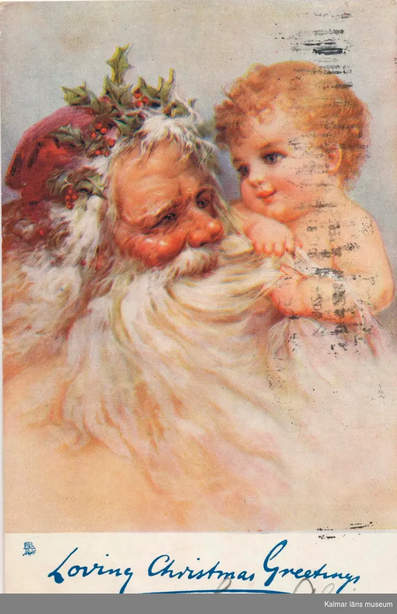 Vykort till Kristina Andersson, född 1865 i Böda, syster till N J Andersson, när hon bodde i USA från vänner i USA. Nedtill står skrivet: Loving Christmas Greetings from Alice.