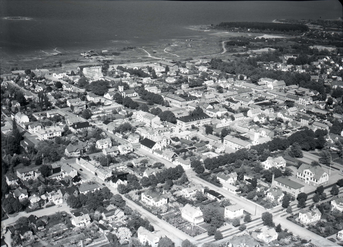 Flygfoto över Borgholm. Samhället med byggnader vägar och kalmarsund.