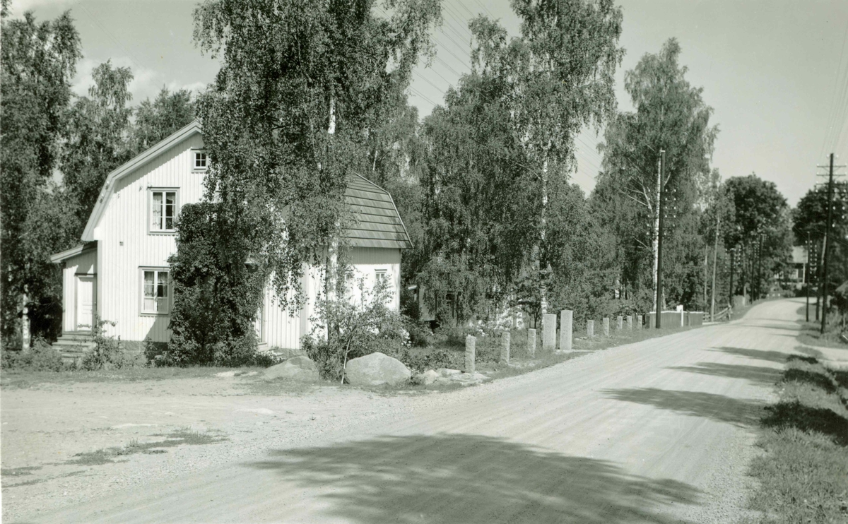 Ett bostadshus vid björkar bredvid en grusväg.