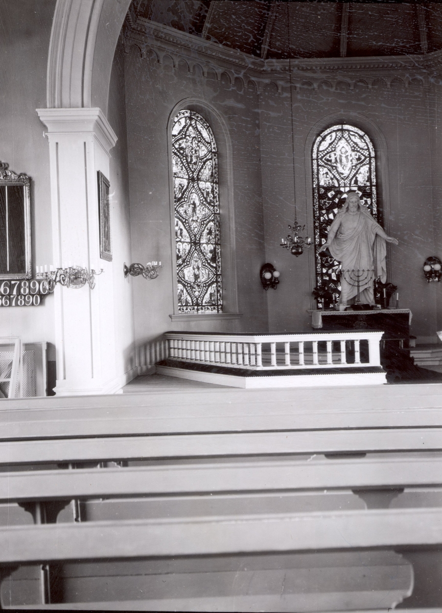 Interiören av Madesjö kyrka. Kyrkbänkar, kyrkfönster, altarring och altaruppsats.
