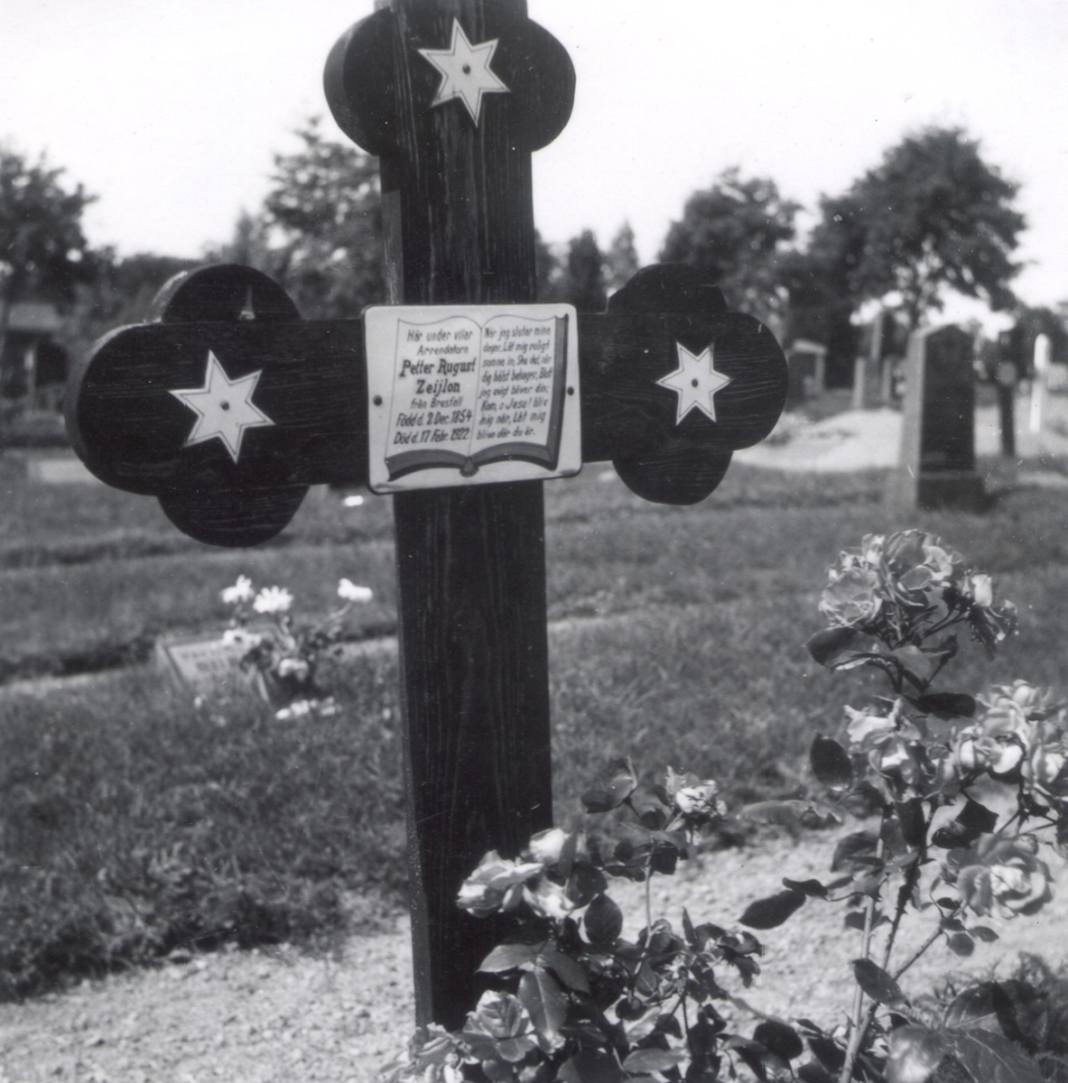 Ett gravkors i trä på kyrkogården vid Hjorteds kyrka.