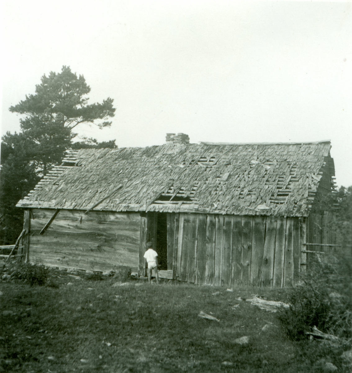 Sjöbod med eldstad, sovkoj och spåntak i dåligt skick.