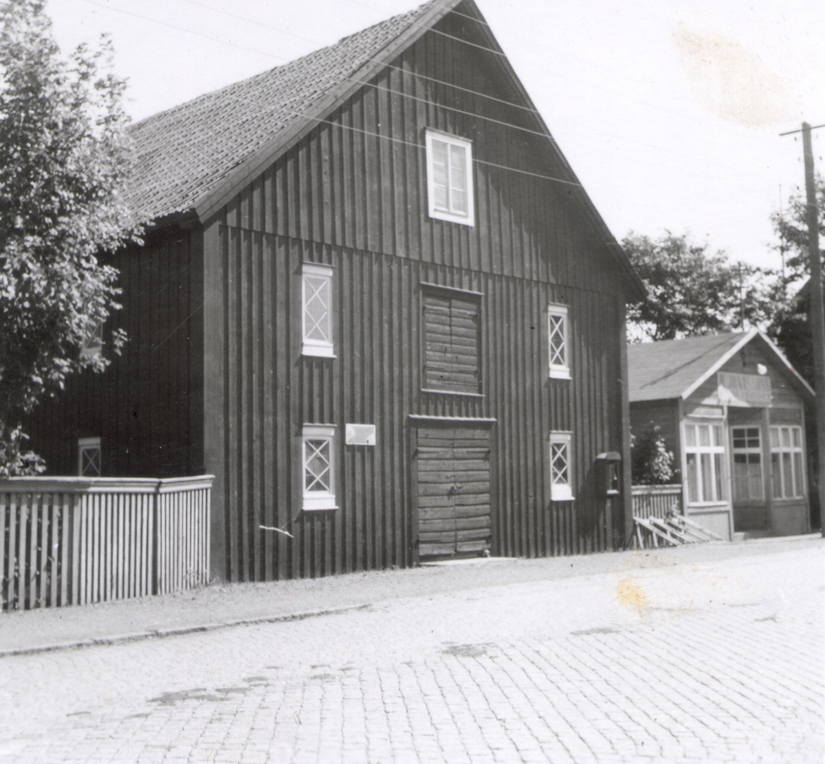 Ett magasin med sadeltak och träpanel i Bergkvara.
