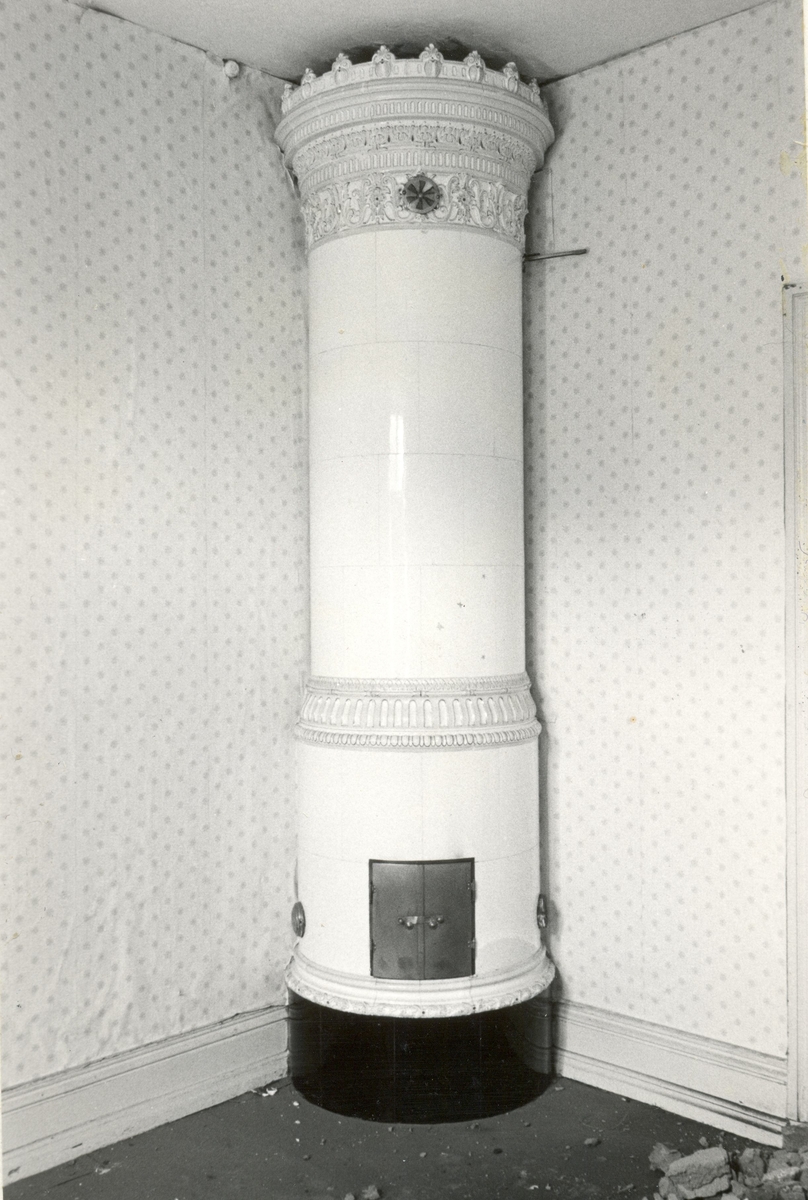 Kakelugn i övre våningen. Färger: rosa, grått, ljusgrönt på vitt.