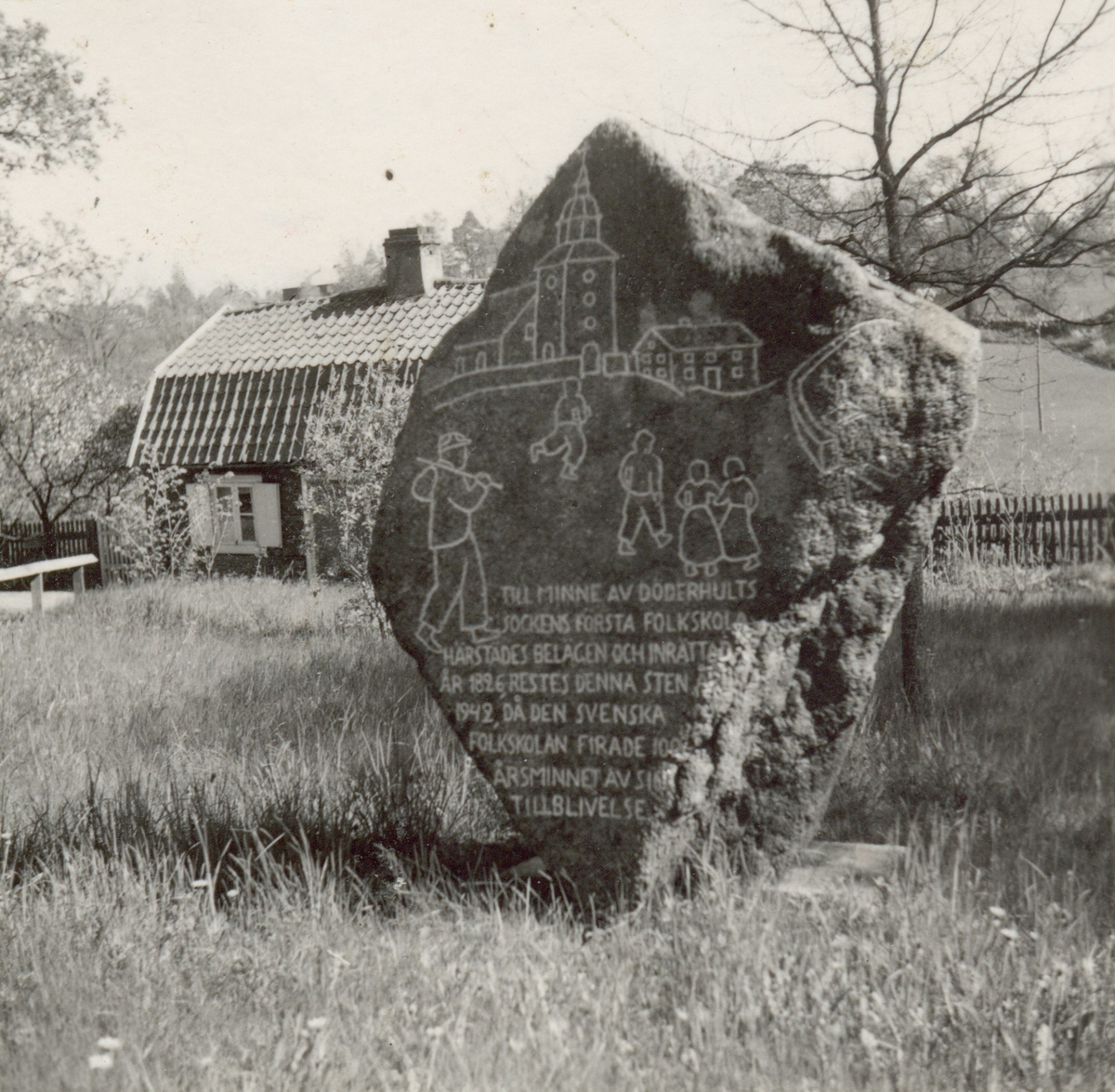 Minnessten över folkskolans 100-årsmine. Vid kyrkan i Döderhult. Konstnär: A. Källström.