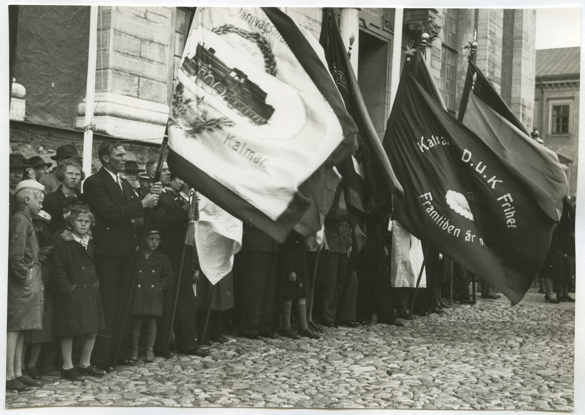 Stortorget Kalmar omkring 1938-1940. Någon högtidsuppslutning av olika organisationer i samband med Sveriges frivilliga civilförsvar.