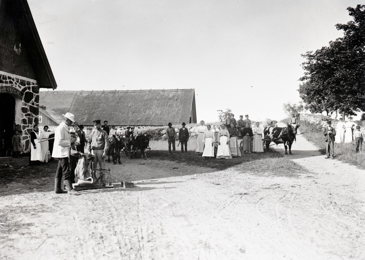 Jordbruksarbete vid Stävlö gård. Män vid en våg i förgrunden och några bönder och oxvagnar därbakom.