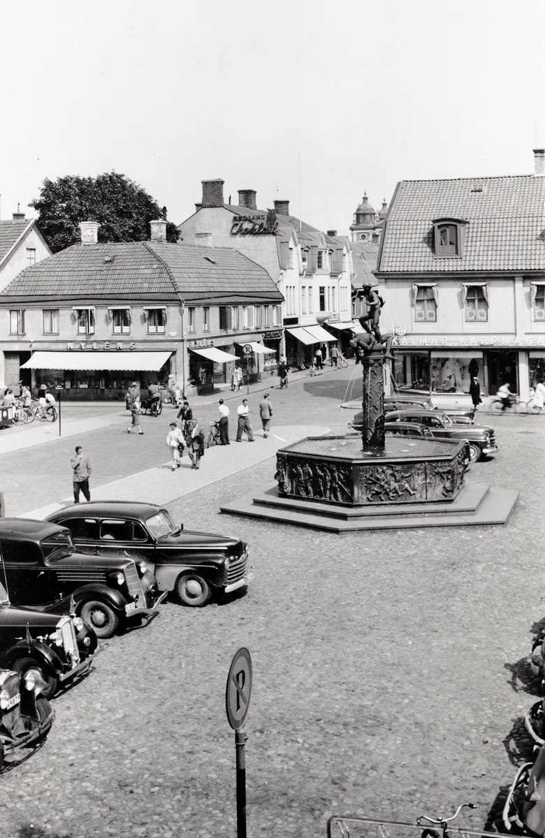 Korsningen Larmgatan och Storgatan. Kv Guldsmeden t.v. Vasabrunnen.