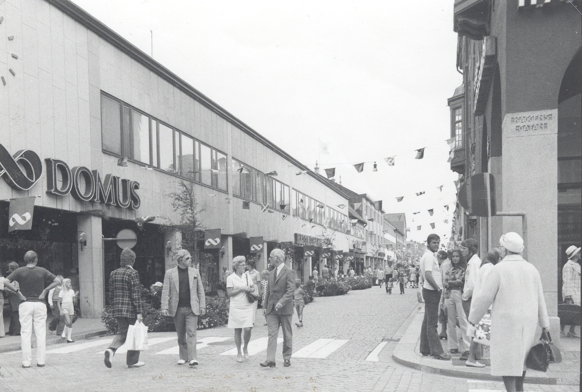 Storgatan mellan 1964 och 1970. Domus är byggt, men biltrafik är fortfarande tillåtet på gatan.