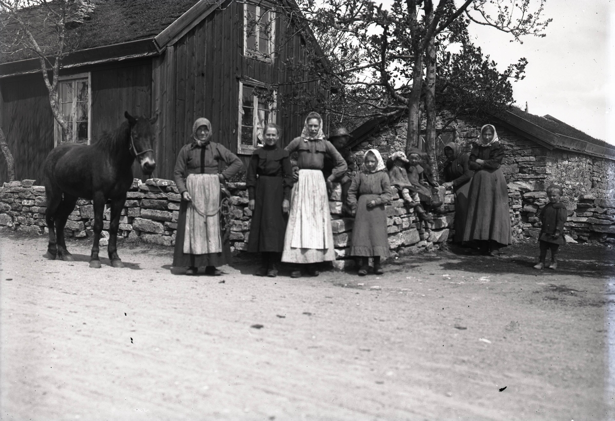 Familjeporträtt från Stenåsa by 1904. Kvinnor och barn fotograferas med den lilla ölandshästen. På en annan bild av samma familj finns även männen med liksom ett stort varmblod, spänt framför en åkvagn.