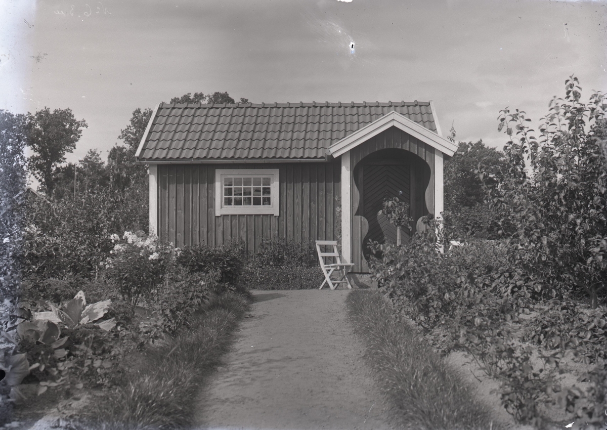 Titel: En stuga vid Kalmar södra koloniområde, fotograferad omkring 1930. Kalmar södra koloniförening grundades 1917 och har idag 105 kolonilotter. Området ligger strax söder om länssjukhuset i Kalmar med huvudingång från Stensbergsvägen.