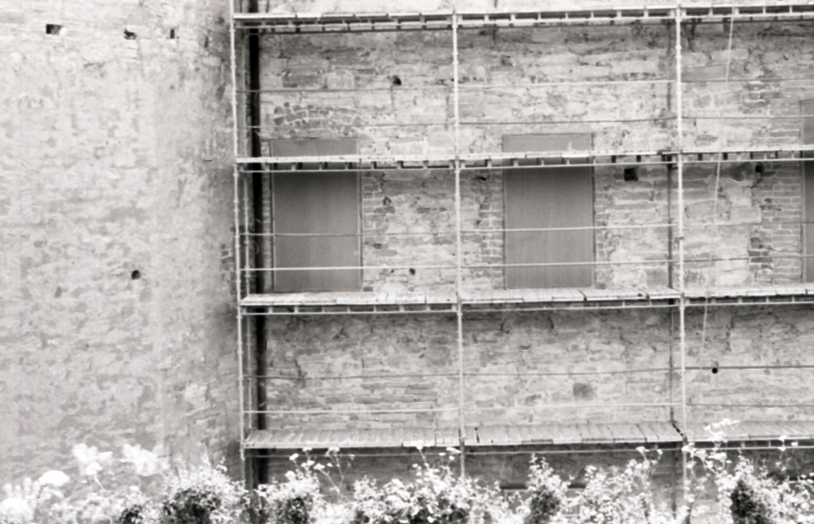 Västra fasadens norra del mellan Kungsmakstornet och Kuretornet. Foto från vallens yttre kant under restaurering