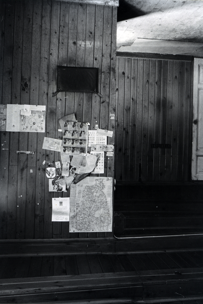 Rum utan eldstad i sista tillbygget. Väggarna klädda med omålad panel. Obs. skarven i taket