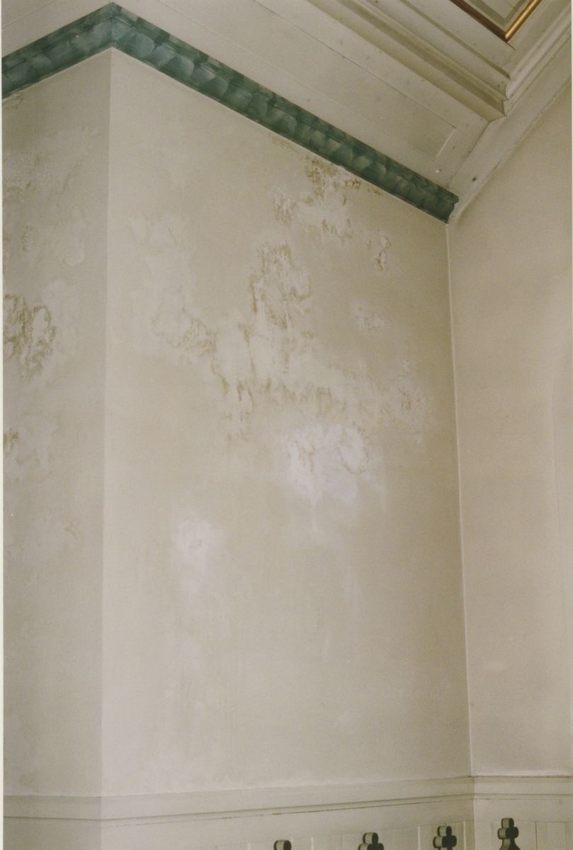 Dalhems kyrka, taklist. Foto från renoveringen 1993.