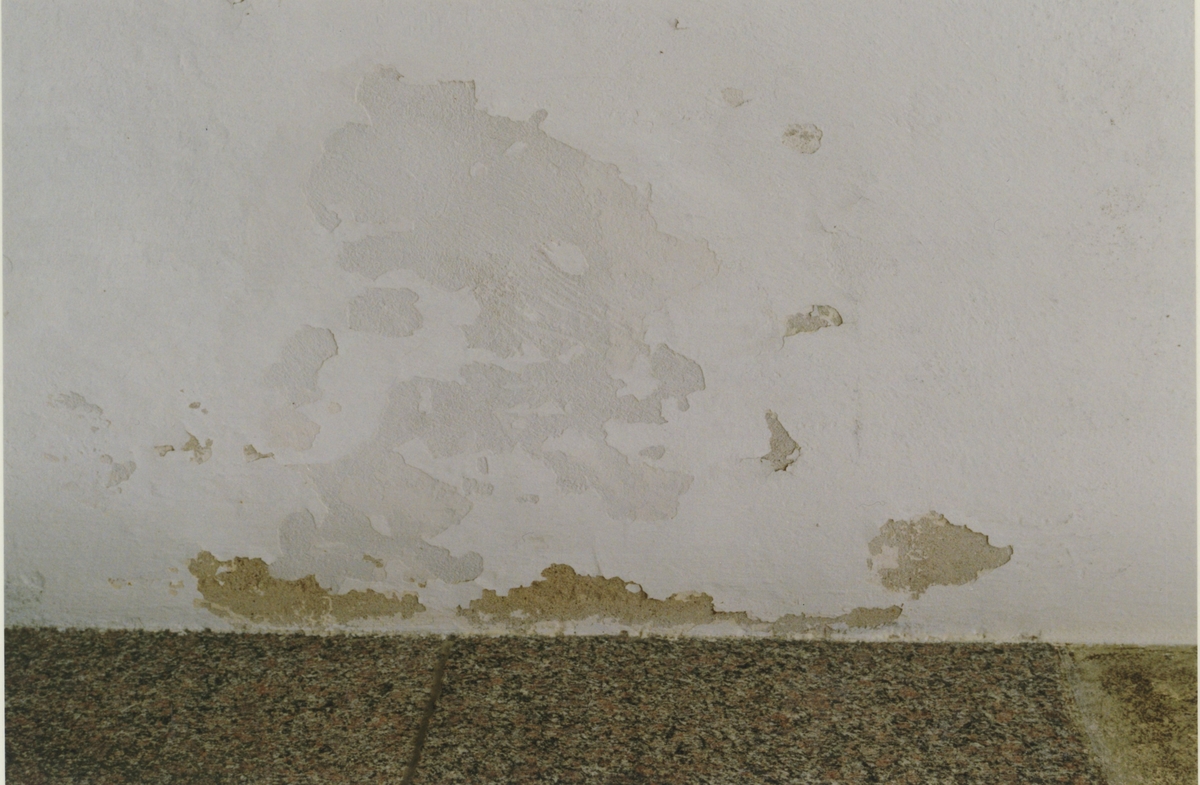 Dalhems kyrka, putsad fasad med stenplatta. Foto från renoveringen 1993.
