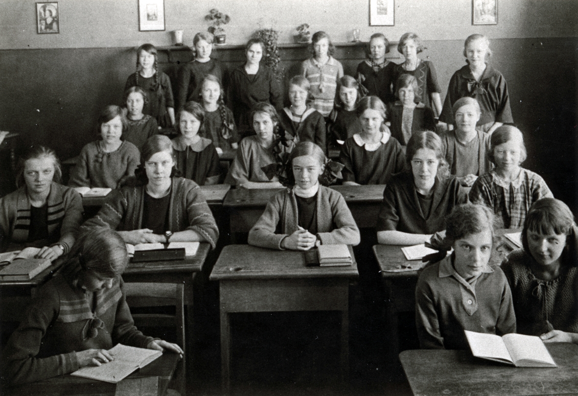 Undervisning i Nisbethska skolan, klass IV B, 1923. Flickor som sitter vid skolbänkar i en skolsal. Några står upp längre bak.