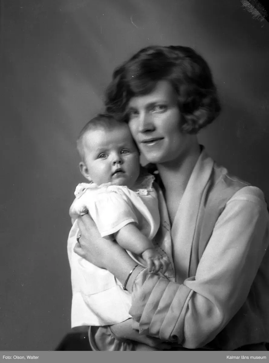 Ateljébild på en kvinna och spädbarn. Enligt Walter Olsons journal är bilden beställd av frun till syssloman Ramertz ifrån Falkenberg.