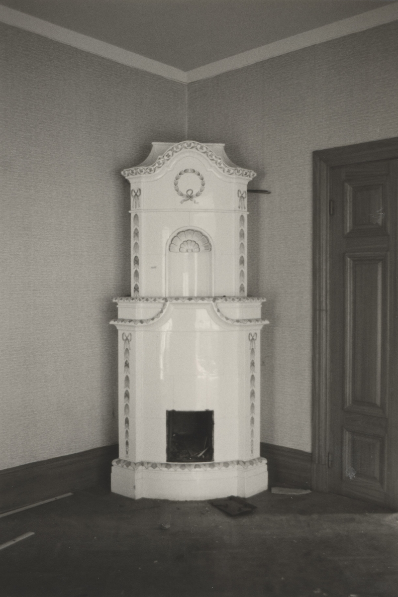 Villa Ekelid, kakelugn, huvudbyggnadens nedervåning. Vit glasyr med blå dekor.