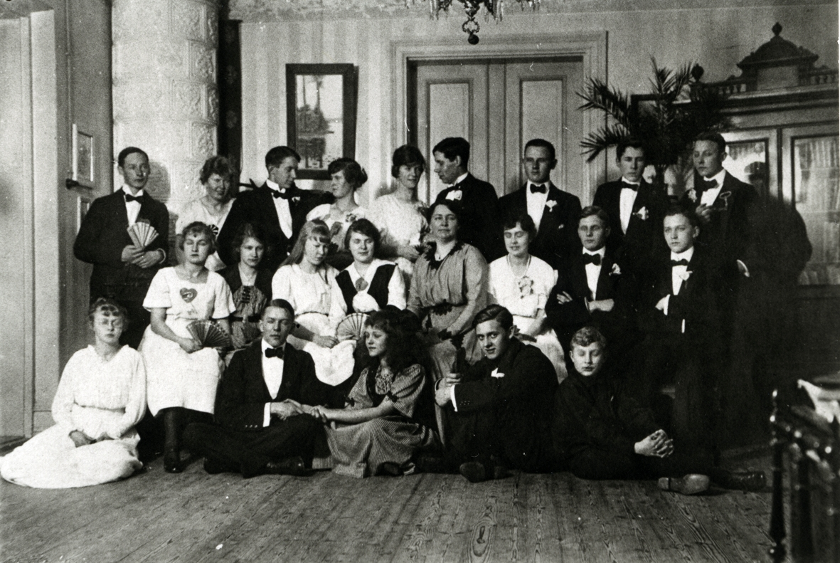 Från vänster fotograf Herman Sandberg, Sigurd Göransson, Elsa Sandberg (?). Sigbritt Höglund, Yngve Johansson, Gagg(Ragnar) Jeansson, Helga Sjöstedt (gift Jeansson), Tessan Elfström, "Pelle" Höglund, Ellen Hultberg (gift Ramerz), fru Höglund, Helge Bruun, Erna Ekstrand, Ture Wicktor, Sandberg,