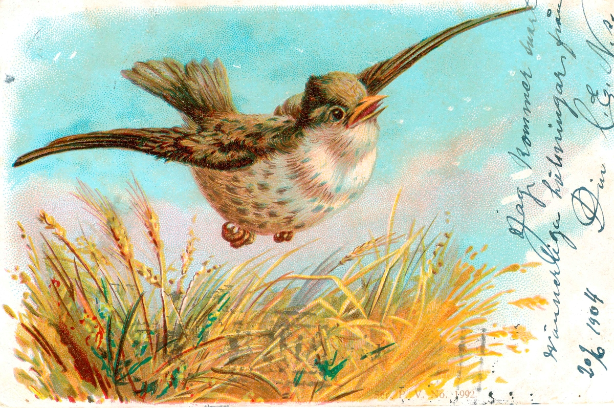 Vykort skickade till Kristina Andersson, född 1865 i Böda, syster till N J Andersson, när hon bodde i USA. Det är skrivet av Edvard Nilsson i Böda. På kortet står det skrivet: "Jag kommer snart, vännerliga hälsningar från Din E Ns 20/6 1904".