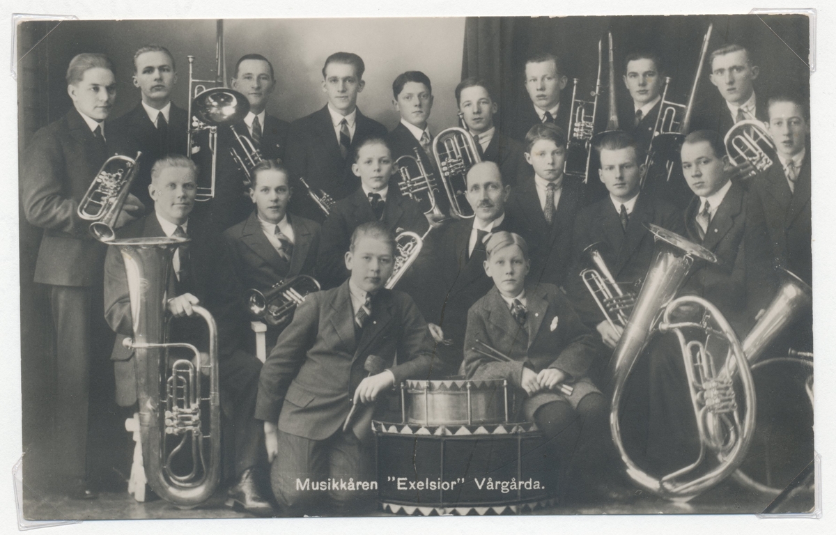 "Musikkåren Excelsior Vårgårda". Fotografiet ingår i en samling med anknytning till skomakare Gustav Johansson med familj, tomt nummer 801, 806 på Malmen i Kalmar.