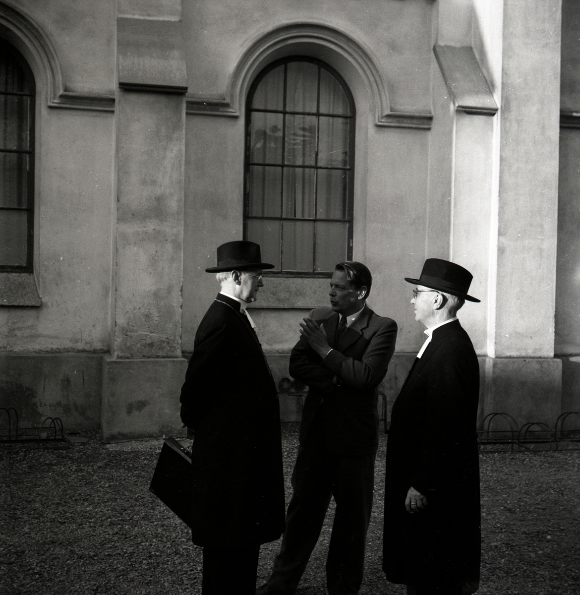Två präster med elvor som prästkrage och en man utan prästkrage.