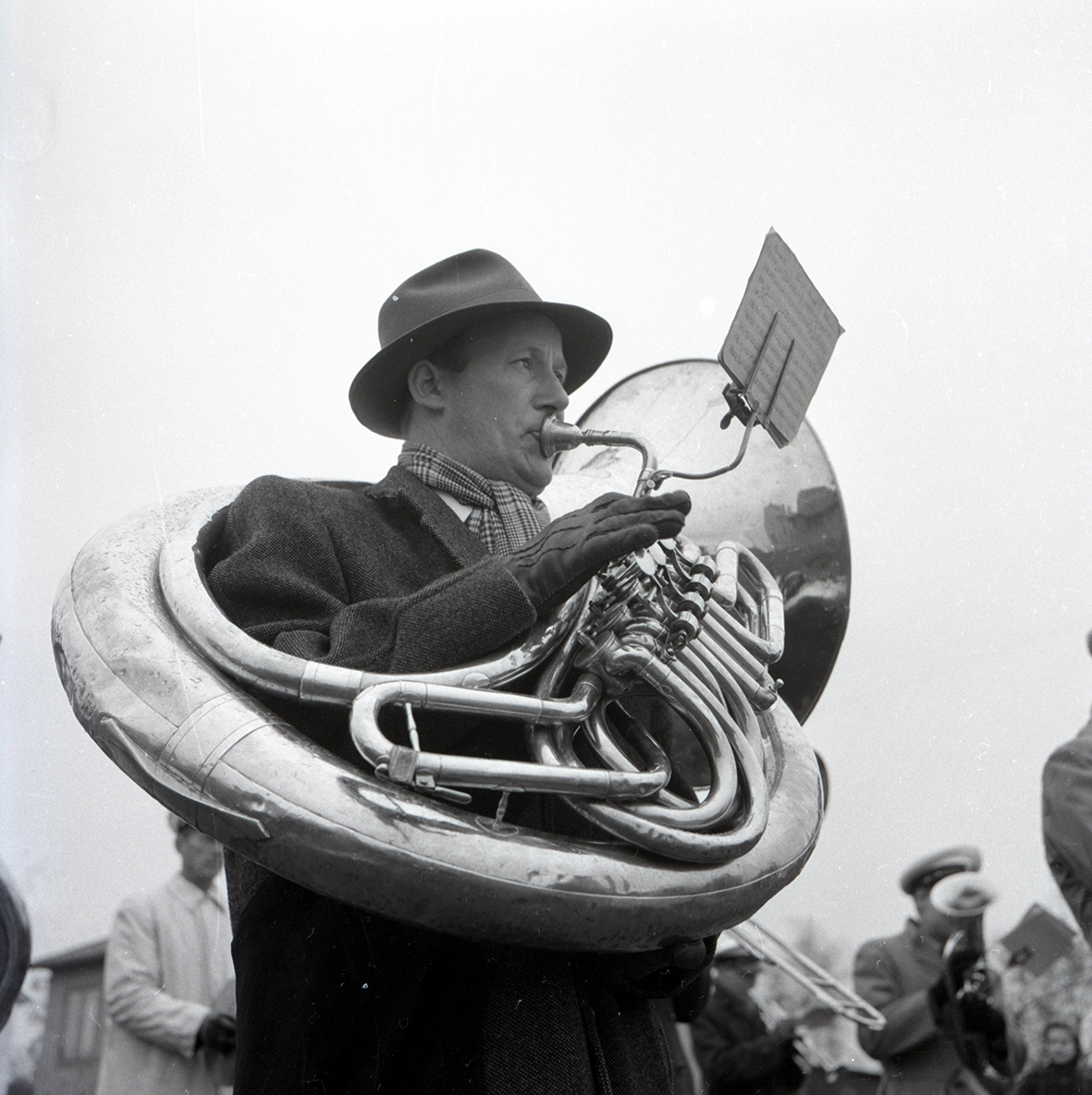 Musikant med bastuba vid förstamajtåg på Öland.