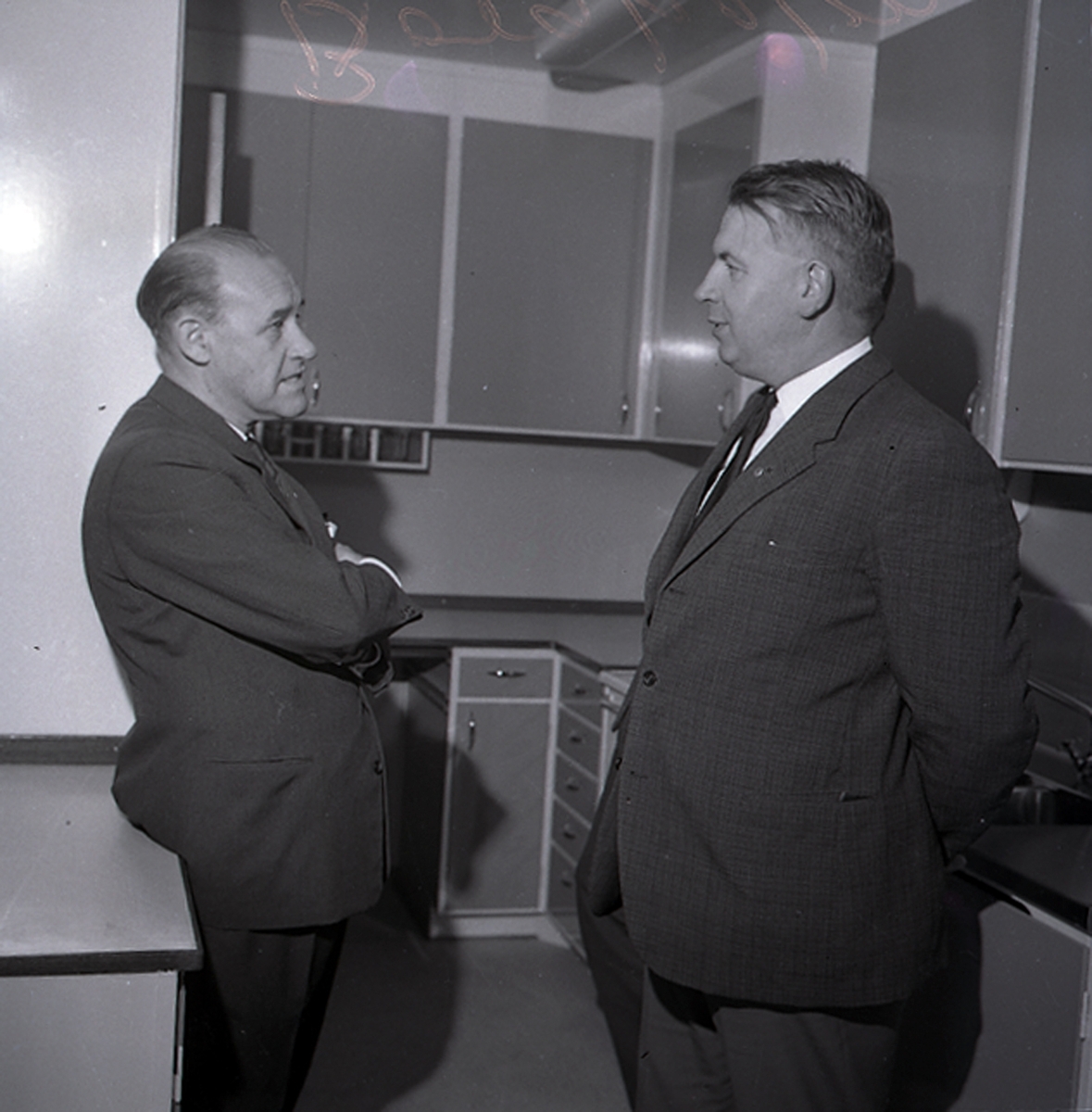 Ivar Nilsson och man vid invigning av Köpingsviks pensionärslägenheter. (Elin Andersson bodde senare i den lägenheten.)