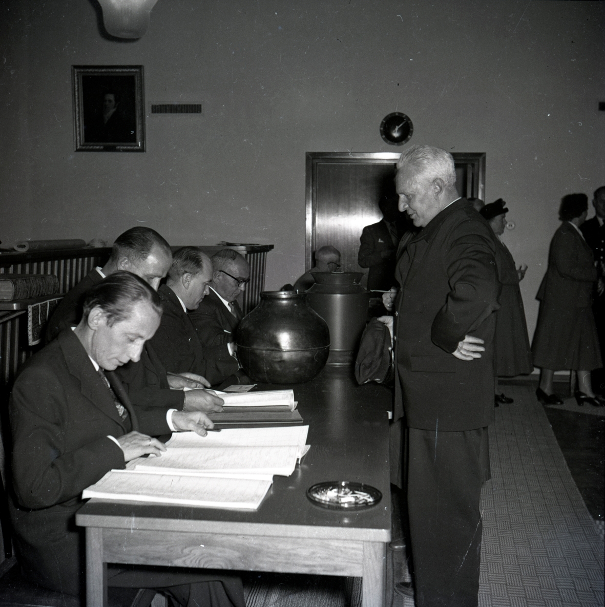 Valet 1954, valförrättning. Bror Hellberg, Bror Svensson, Albin T. Forsman och valarbetare.