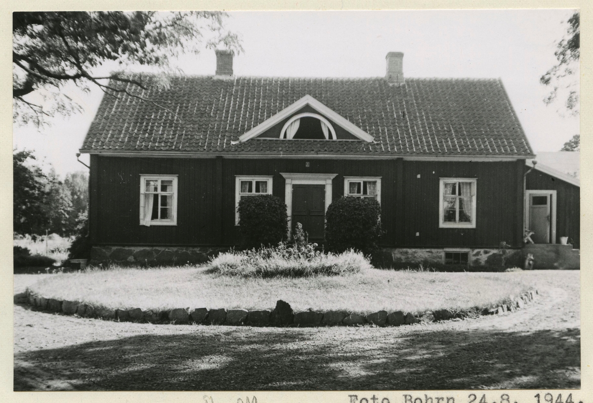 Manbyggnaden, knuttimrad, klädd med panel av stående brädor med täcklister, tak av enkupigt tegel. Rödmålad med vita dörr- och fönsterfoder samt vit taklist. Dörren ut till terrassen i vinkeln mellan själva huset och tillbygget utfört nyligen. (1944)