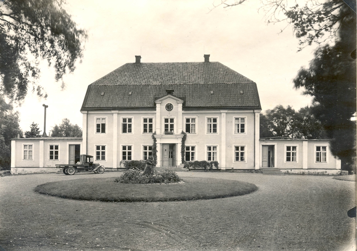 Råsnäs. Huvudbyggningens mittparti uppfört 1756, de låga flyglarna under 1800-talet. Timmer, putsreveterat. Väggar gula, pilastrar och foder vita.